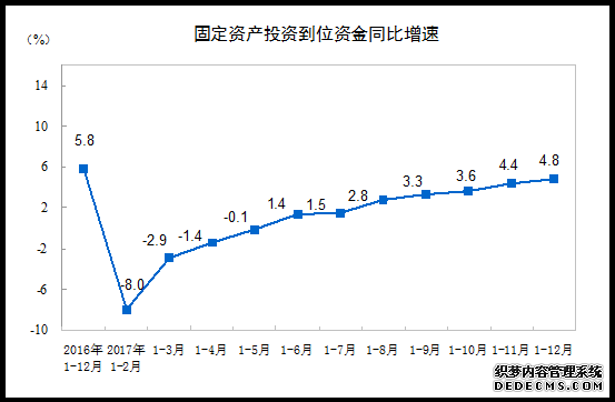从到位资金情况看,固定资产投资到位资金629815亿元,比上年增长4.8%,增速比1-11月份提高0.4个百分点。其中,国家预算资金增长7.8%,增速回落1.7个百分点;国内贷款增长9.0%,增速回落0.3个百分点;自筹资金增长2.3%,增速提高0.6个百分点;利用外资比上年下降3.1%,降幅收窄0.7个百分点;其他资金比上年增长11.6%,增速提高0.5个百分点。